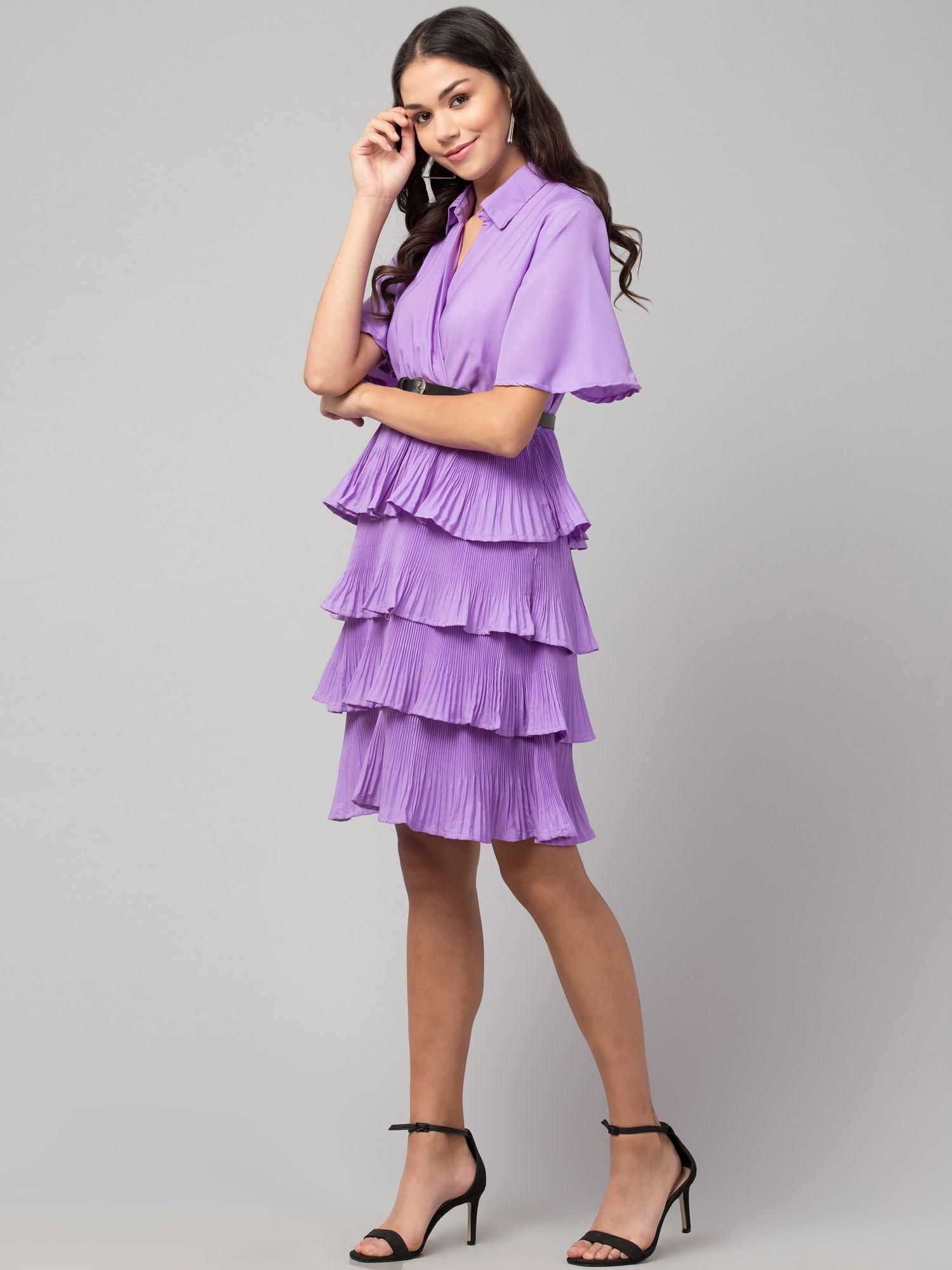 Oceanista Women's Crepe Solid Shirt Collar Flared Lavendar Short Dress